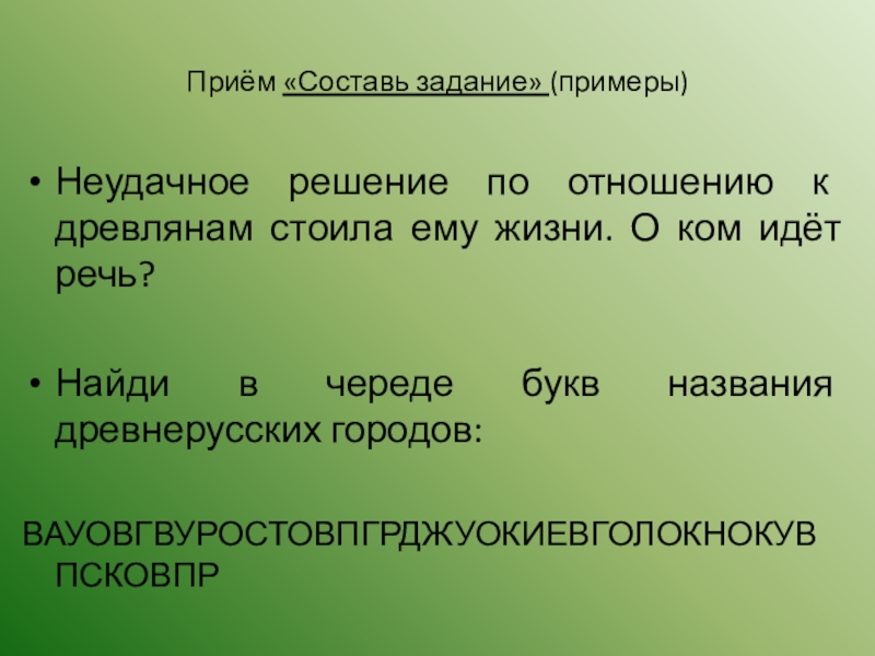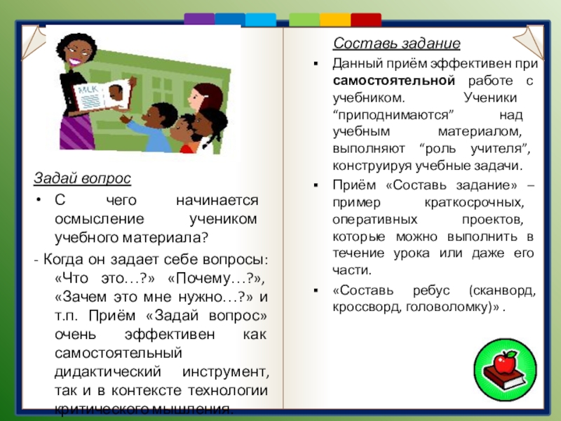 Приём «Составь задание» – пример краткосрочных, оперативных проектов, которые можно выполнить в течение урока или даже его части.
