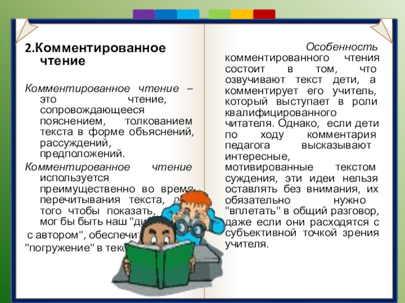 Особенность комментированного чтения состоит в том, что озвучивают текст дети, а комментирует его учитель, который выступает в роли квалифицированного читателя. Однако, если дети по ходу комментария педагога высказывают интересные, мотивированные текстом суждения, эти идеи нельзя оставлять без внимания, их обязательно нужно "вплетать" в общий разговор, даже если они расходятся с субъективной точкой зрения учителя.