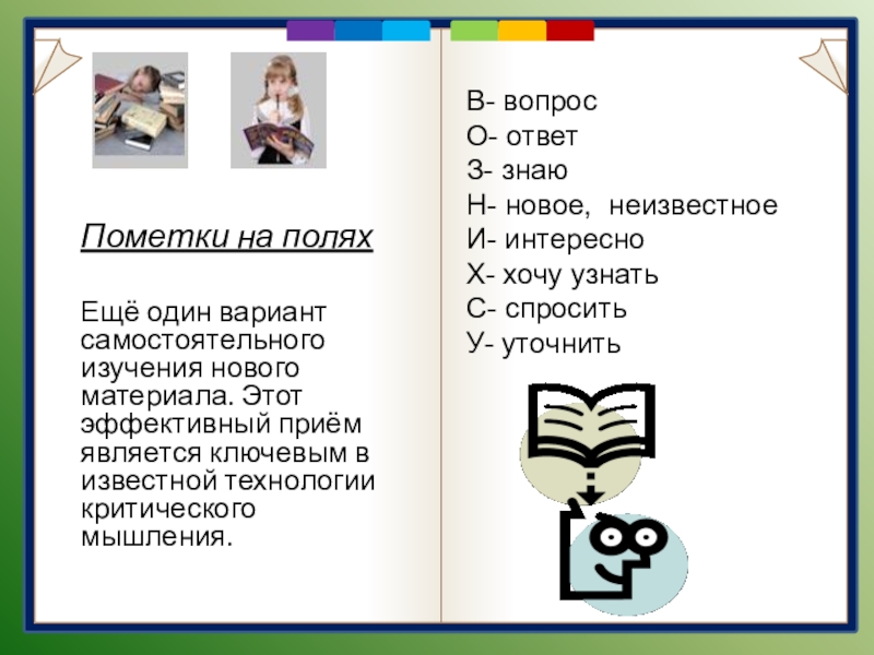 Данный приём эффективен при самостоятельной работе с учебником. Ученики “приподнимаются” над учебным материалом, выполняют “роль учителя”, конструируя учебные задачи.