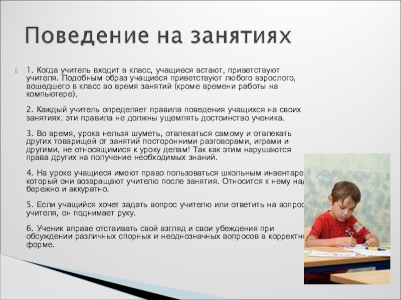 2. Каждый учитель определяет правила поведения учащихся на своих занятиях; эти правила не должны ущемлять достоинство ученика.