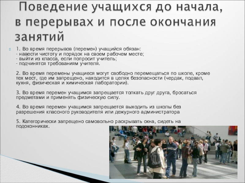Слайд 51. Во время перерывов (перемен) учащийся обязан: