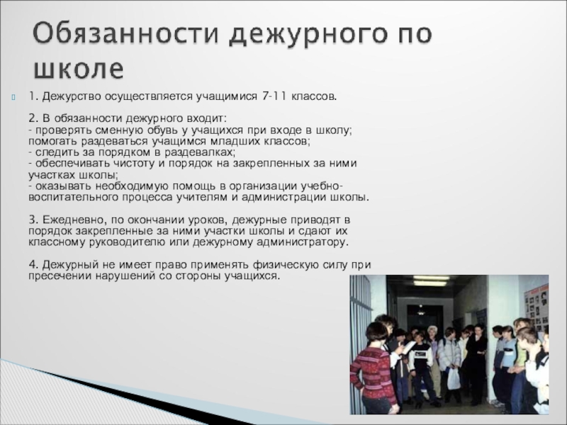 Слайд 81. Дежурство осуществляется учащимися 7-11 классов.