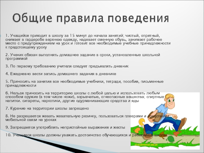 Слайд 31. Учащийся приходит в школу за 15 минут до начала занятий;