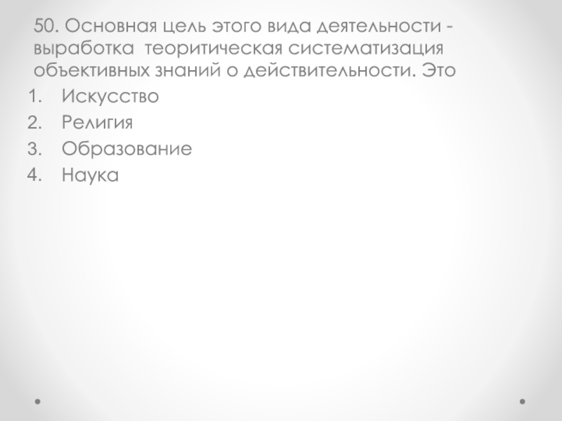 Слайд 5550. Основная цель этого вида деятельности - выработка теоритическая систематизация объективных