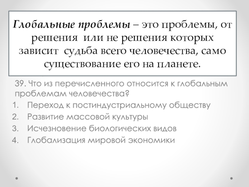 Глобальные проблемы – это проблемы, от решения или не решения которых зависит судьба всего человечества, само существование его на планете.