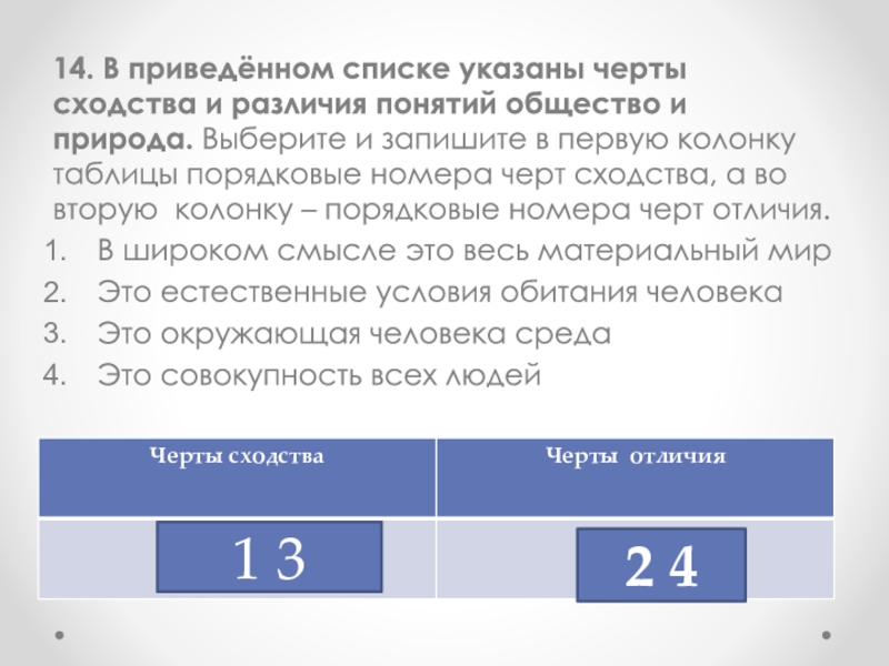 Слайд 1414. В приведённом списке указаны черты сходства и различия понятий общество