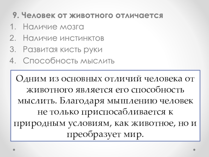 основных отличий человека от животного является его способность мыслить. Благодаря мышлению человек не только приспосабливается к природным условиям, как животное, но и преобразует мир.