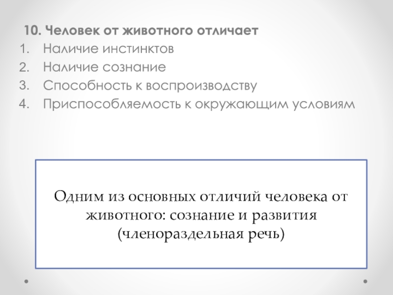 Одним из основных отличий человека от животного: сознание и развития (членораздельная речь)
