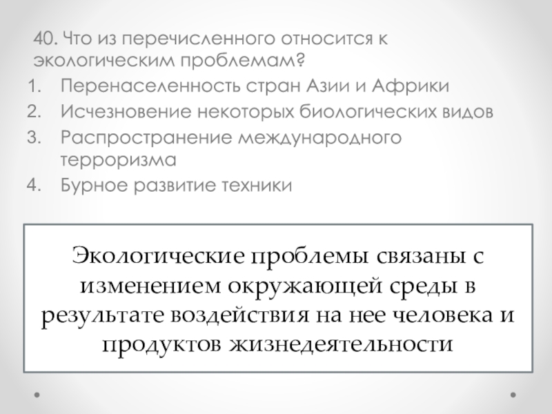 Слайд 4140. Что из перечисленного относится к экологическим проблемам?