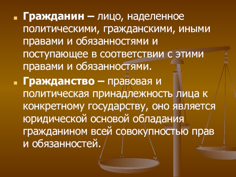 Слайд 8Гражданин – лицо, наделенное политическими, гражданскими, иными правами и обязанностями и