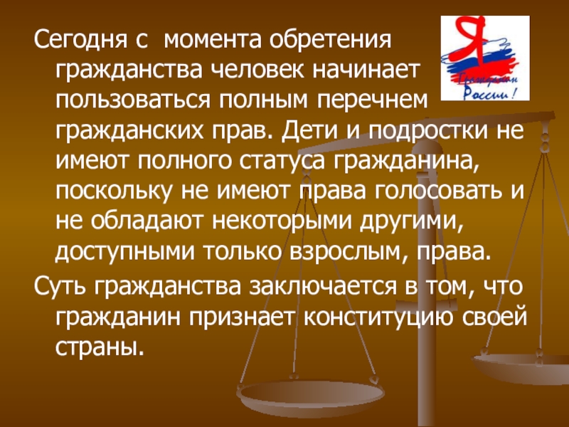 Слайд 10Сегодня с момента обретения гражданства человек начинает пользоваться полным перечнем гражданских