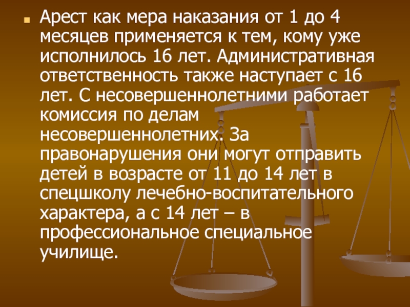 тем, кому уже исполнилось 16 лет. Административная ответственность также наступает с 16 лет. С несовершеннолетними работает комиссия по делам несовершеннолетних. За правонарушения они могут отправить детей в возрасте от 11 до 14 лет в спецшколу лечебно-воспитательного характера, а с 14 лет – в профессиональное специальное училище.