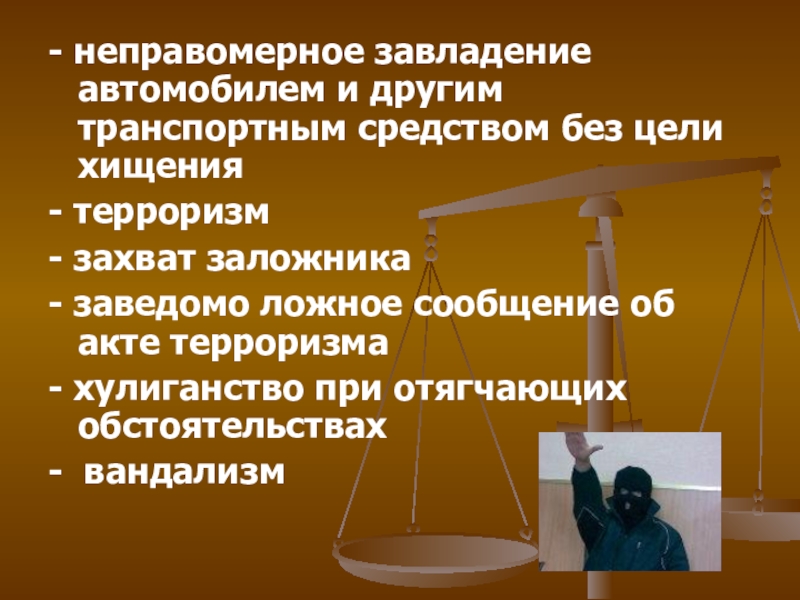 Слайд 19- неправомерное завладение автомобилем и другим транспортным средством без цели хищения