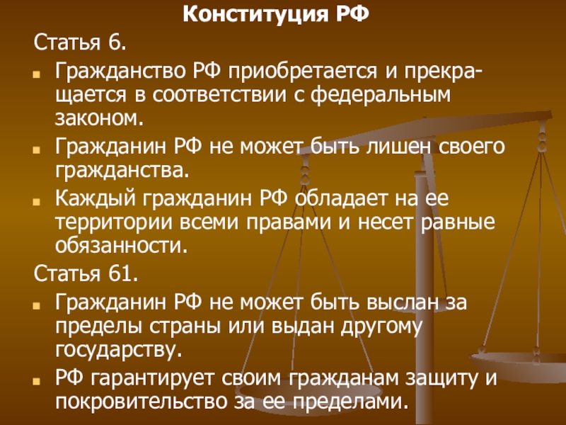 Гражданин РФ не может быть выслан за пределы страны или выдан другому государству.