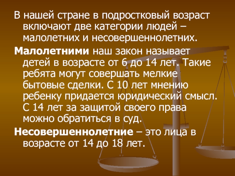 Малолетними наш закон называет детей в возрасте от 6 до 14 лет. Такие ребята могут совершать мелкие бытовые сделки. С 10 лет мнению ребенку придается юридический смысл. С 14 лет за защитой своего права можно обратиться в суд.