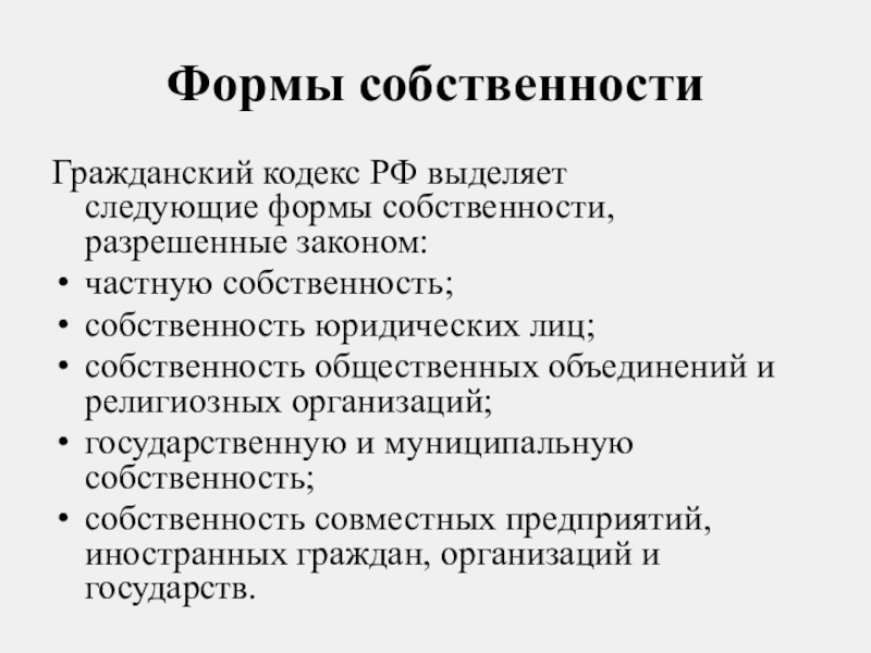 Гражданский кодекс РФ выделяет следующие формы собственности, разрешенные законом: