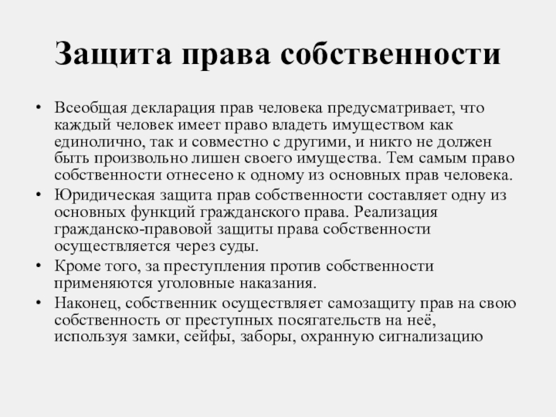 Наконец, собственник осуществляет самозащиту прав на свою собственность от преступных посягательств на неё, используя замки, сейфы, заборы, охранную сигнализацию