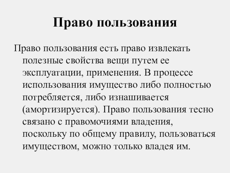эксплуатации, применения. В процессе использования имущество либо полностью потребляется, либо изнашивается (амортизируется). Право пользования тесно связано с правомочиями владения, поскольку по общему правилу, пользоваться имуществом, можно только владея им.