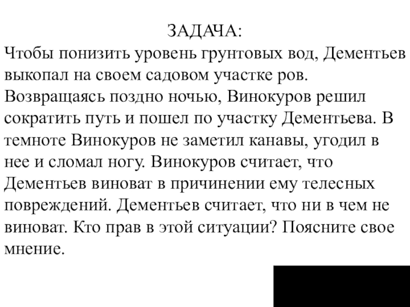 ров. Возвращаясь поздно ночью, Винокуров решил сократить путь и пошел по участку Дементьева. В темноте Винокуров не заметил канавы, угодил в нее и сломал ногу. Винокуров считает, что Дементьев виноват в причинении ему телесных повреждений. Дементьев считает, что ни в чем не виноват. Кто прав в этой ситуации? Поясните свое мнение.
