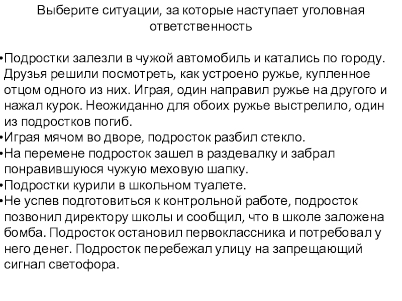 Слайд 37Выберите ситуации, за которые наступает уголовная ответственность