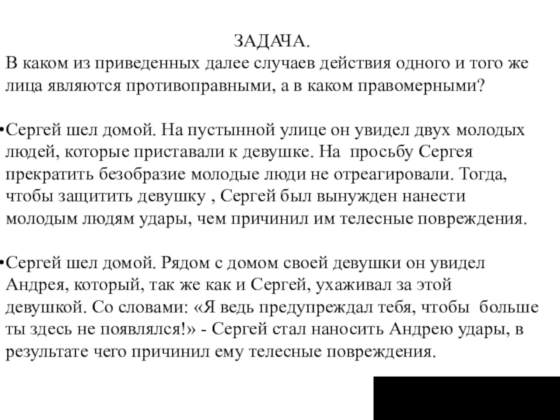 Сергей шел домой. На пустынной улице он увидел двух молодых людей, которые приставали к девушке. На просьбу Сергея прекратить безобразие молодые люди не отреагировали. Тогда, чтобы защитить девушку , Сергей был вынужден нанести молодым людям удары, чем причинил им телесные повреждения.