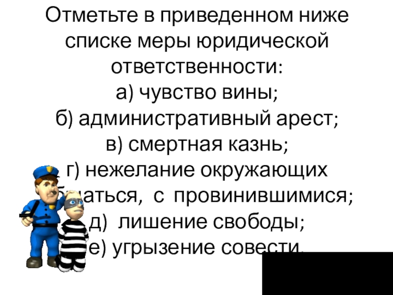 Слайд 28Отметьте в приведенном ниже списке меры юридической ответственности: