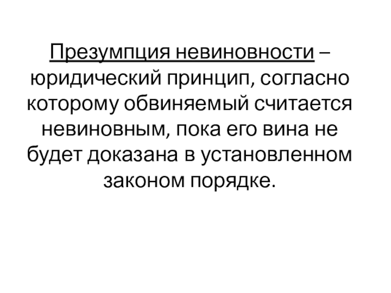 Слайд 31Презумпция невиновности – юридический принцип, согласно которому обвиняемый считается невиновным, пока