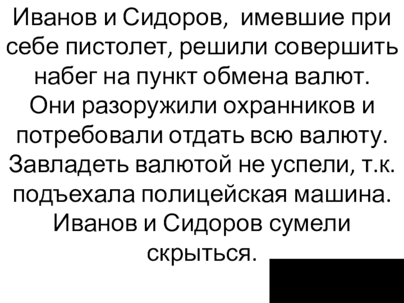 Слайд 23Иванов и Сидоров, имевшие при себе пистолет, решили совершить набег на