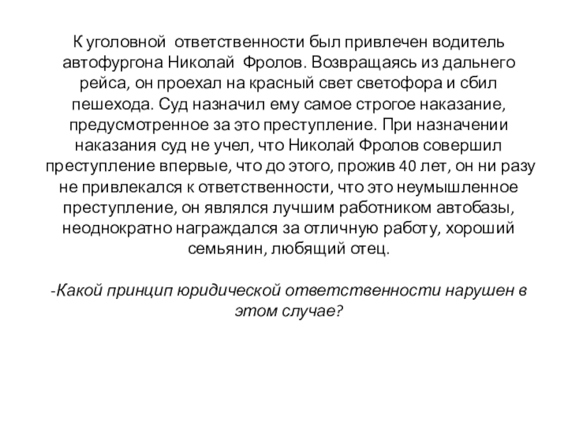 дальнего рейса, он проехал на красный свет светофора и сбил пешехода. Суд назначил ему самое строгое наказание, предусмотренное за это преступление. При назначении наказания суд не учел, что Николай Фролов совершил преступление впервые, что до этого, прожив 40 лет, он ни разу не привлекался к ответственности, что это неумышленное преступление, он являлся лучшим работником автобазы, неоднократно награждался за отличную работу, хороший семьянин, любящий отец.