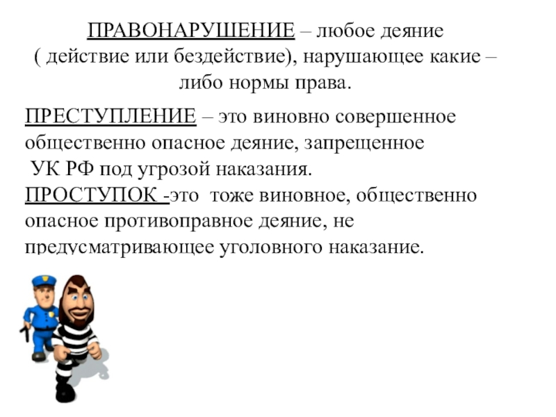 ПРОСТУПОК -это тоже виновное, общественно опасное противоправное деяние, не предусматривающее уголовного наказание.