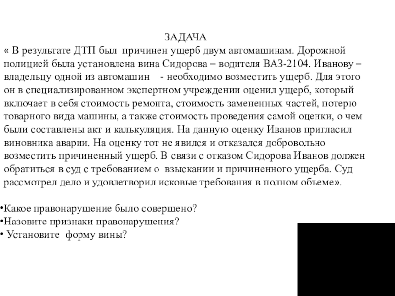 была установлена вина Сидорова – водителя ВАЗ-2104. Иванову – владельцу одной из автомашин - необходимо возместить ущерб. Для этого он в специализированном экспертном учреждении оценил ущерб, который включает в себя стоимость ремонта, стоимость замененных частей, потерю товарного вида машины, а также стоимость проведения самой оценки, о чем были составлены акт и калькуляция. На данную оценку Иванов пригласил виновника аварии. На оценку тот не явился и отказался добровольно возместить причиненный ущерб. В связи с отказом Сидорова Иванов должен обратиться в суд с требованием о взыскании и причиненного ущерба. Суд рассмотрел дело и удовлетворил исковые требования в полном объеме».