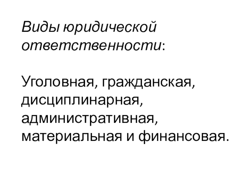 Уголовная, гражданская, дисциплинарная, административная, материальная и финансовая.
