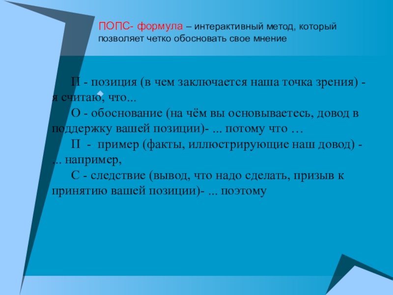 Слайд 11ПОПС- формула – интерактивный метод, который позволяет четко обосновать свое мнение