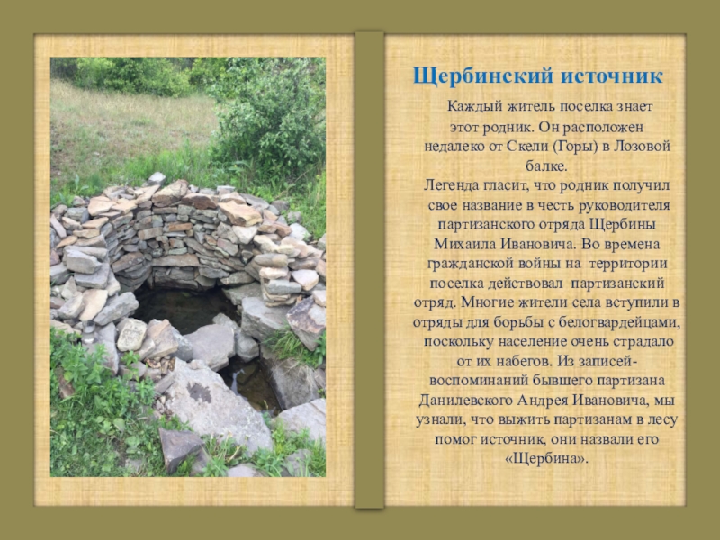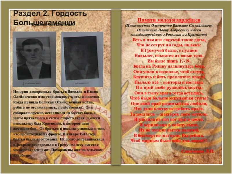 История двоюродных братьев Василия и Ивана Олейниченко известна каждому жителю поселка. Когда пришла Великая Отечественная война, ребята не отсиживались, а действовали. Они собирали оружие, оставшееся на местах боев, а затем прятали его в стены старого сарая. Совсем неподалеку был Краснодон, в котором шли жестокие бои. От братьев в поселке узнавали о том, что происходило на фронте. В январе 1943 года братья были арестованы. Их долго допрашивали, а в феврале расстреляли в Гремучем лесу вместе с молодогвардейцами. Похоронены они на сельском кладбище.