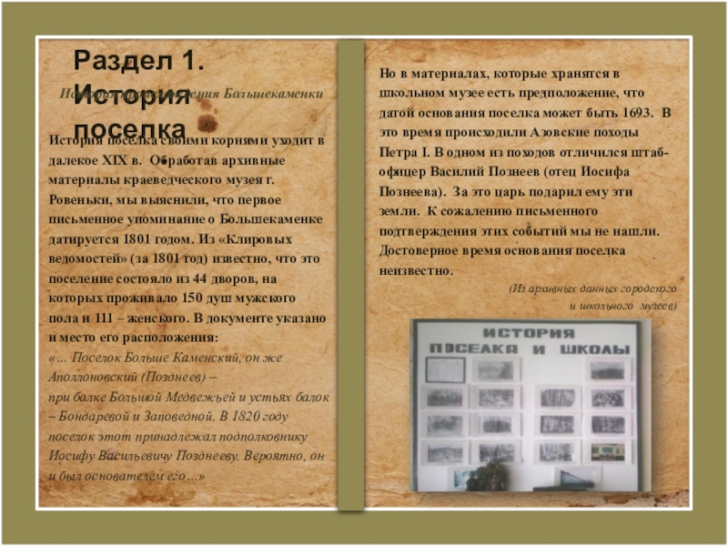 Но в материалах, которые хранятся в школьном музее есть предположение, что датой основания поселка может быть 1693. В это время происходили Азовские походы Петра I. В одном из походов отличился штаб-офицер Василий Познеев (отец Иосифа Познеева). За это царь подарил ему эти земли. К сожалению письменного подтверждения этих событий мы не нашли. Достоверное время основания поселка неизвестно.
