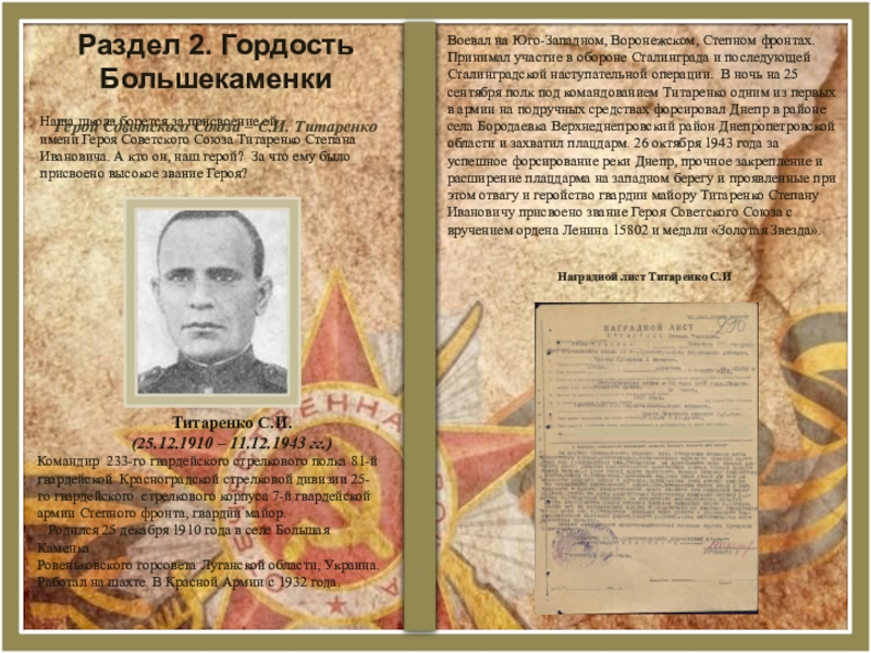 Командир 233-го гвардейского стрелкового полка 81-й гвардейской Красноградской стрелковой дивизии 25-го гвардейского стрелкового корпуса 7-й гвардейской армии Степного фронта, гвардии майор.