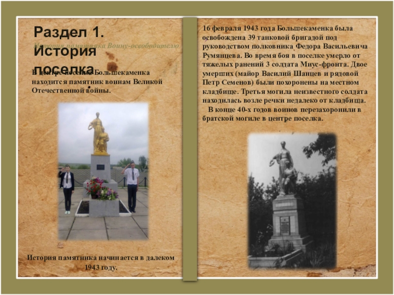 16 февраля 1943 года Большекаменка была освобождена 39 танковой бригадой под руководством полковника Федора Васильевича Румянцева. Во время боя в поселке умерло от тяжелых ранений 3 солдата Миус-фронта. Двое умерших (майор Василий Шанцев и рядовой Петр Семенов) были похоронены на местном кладбище. Третья могила неизвестного солдата находилась возле речки недалеко от кладбища.