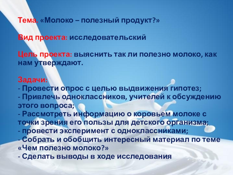 Слайд 4Тема. «Молоко – полезный продукт?»