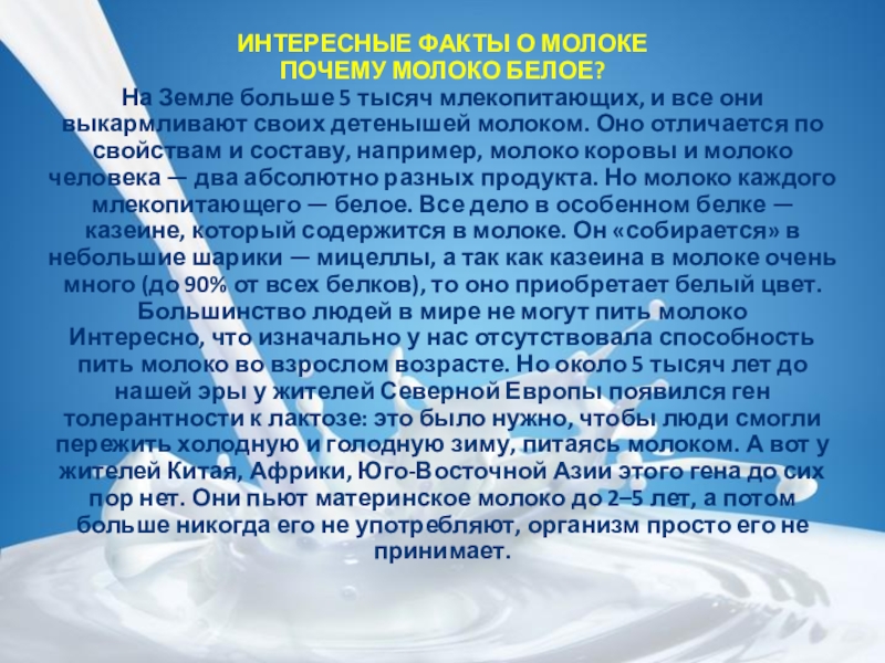 Слайд 18ИНТЕРЕСНЫЕ ФАКТЫ О МОЛОКЕ