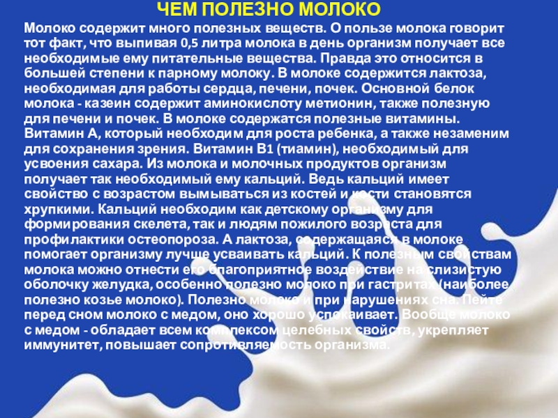 тот факт, что выпивая 0,5 литра молока в день организм получает все необходимые ему питательные вещества. Правда это относится в большей степени к парному молоку. В молоке содержится лактоза, необходимая для работы сердца, печени, почек. Основной белок молока - казеин содержит аминокислоту метионин, также полезную для печени и почек. В молоке содержатся полезные витамины. Витамин А, который необходим для роста ребенка, а также незаменим для сохранения зрения. Витамин В1 (тиамин), необходимый для усвоения сахара. Из молока и молочных продуктов организм получает так необходимый ему кальций. Ведь кальций имеет свойство с возрастом вымываться из костей и кости становятся хрупкими. Кальций необходим как детскому организму для формирования скелета, так и людям пожилого возраста для профилактики остеопороза. А лактоза, содержащаяся в молоке помогает организму лучше усваивать кальций. К полезным свойствам молока можно отнести его благоприятное воздействие на слизистую оболочку желудка, особенно полезно молоко при гастритах (наиболее полезно козье молоко). Полезно молоко и при нарушениях сна. Пейте перед сном молоко с медом, оно хорошо успокаивает. Вообще молоко с медом - обладает всем комплексом целебных свойств, укрепляет иммунитет, повышает сопротивляемость организма.
