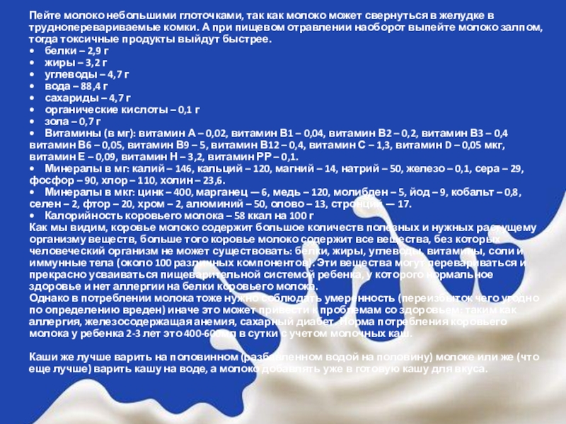 Слайд 12Пейте молоко небольшими глоточками, так как молоко может свернуться в желудке