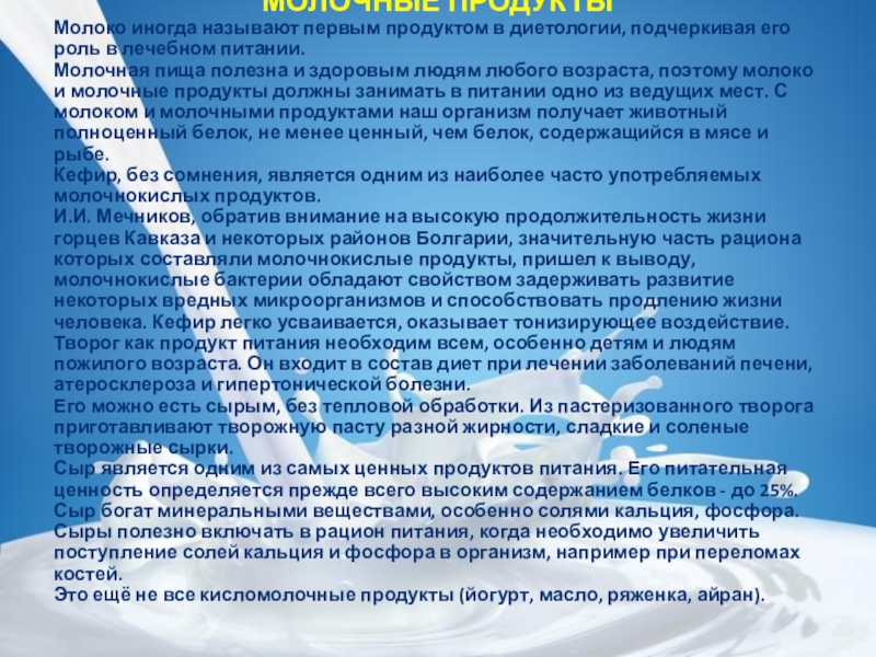 Молочная пища полезна и здоровым людям любого возраста, поэтому молоко и молочные продукты должны занимать в питании одно из ведущих мест. С молоком и молочными продуктами наш организм получает животный полноценный белок, не менее ценный, чем белок, содержащийся в мясе и рыбе.