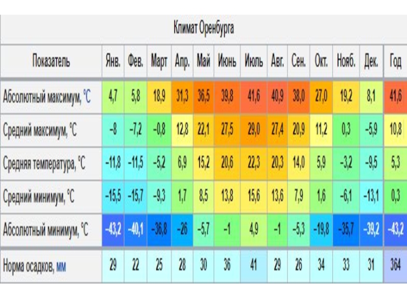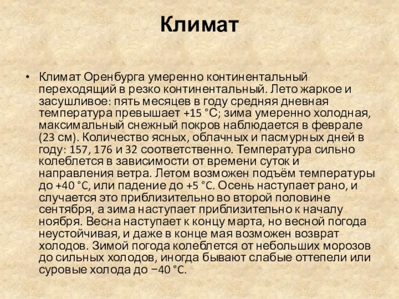 Климат Климат Оренбурга умеренно континентальный переходящий в резко континентальный. Лето жаркое и засушливое: пять месяцев в году