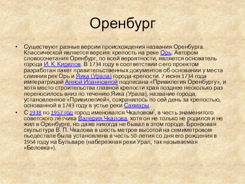 ОренбургСуществуют разные версии происхождения названия Оренбурга. Классической является версия: крепость на реке Орь. Автором словосочетания Оренбург, по всей