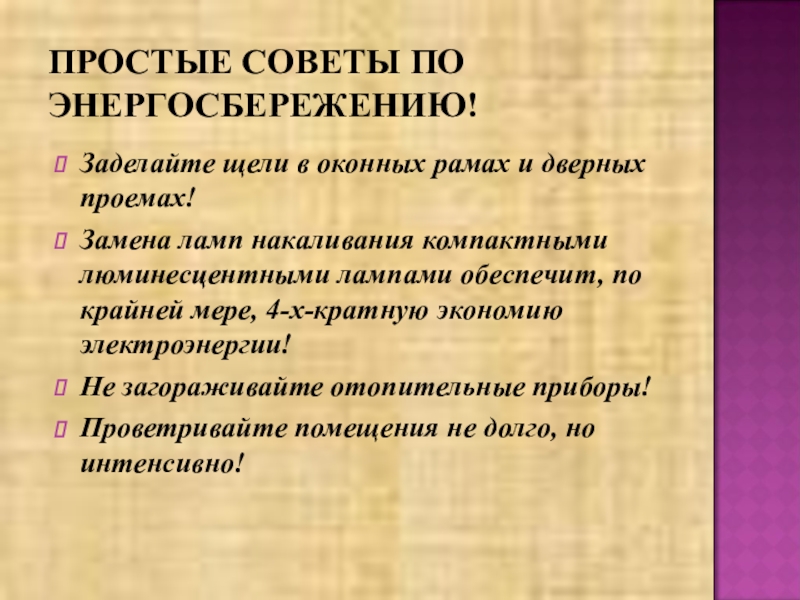 ПРОСТЫЕ СОВЕТЫ ПО ЭНЕРГОСБЕРЕЖЕНИЮ!Заделайте щели в оконных рамах и дверных проемах! Замена ламп накаливания компактными люминесцентными лампами