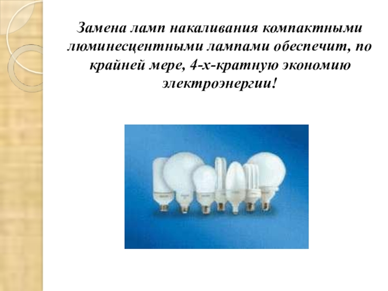 Слайд 13Замена ламп накаливания компактными люминесцентными лампами обеспечит, по крайней мере, 4-х-кратную