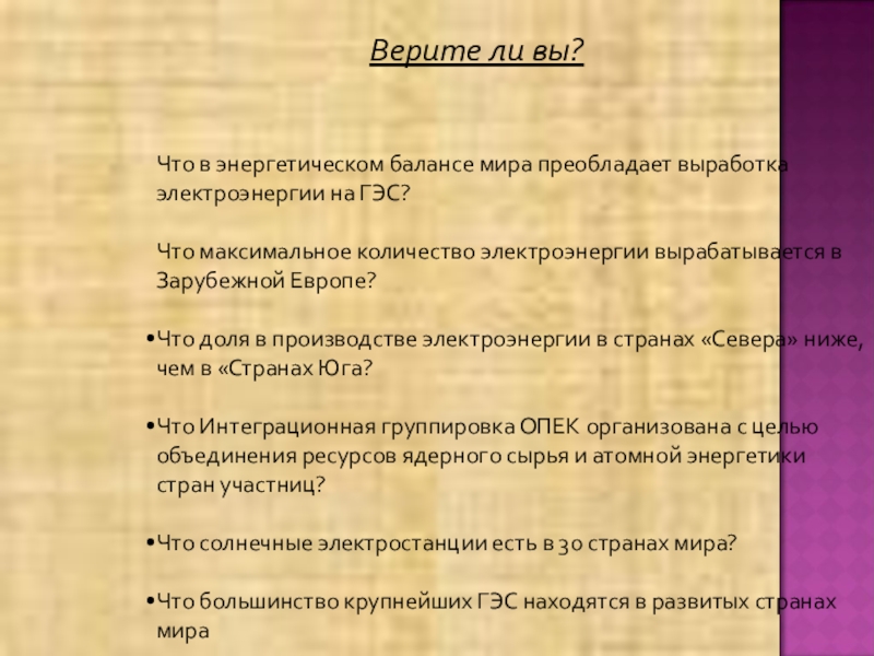 Верите ли вы?Что в энергетическом балансе мира преобладает выработка электроэнергии на ГЭС?Что максимальное количество электроэнергии вырабатывается в