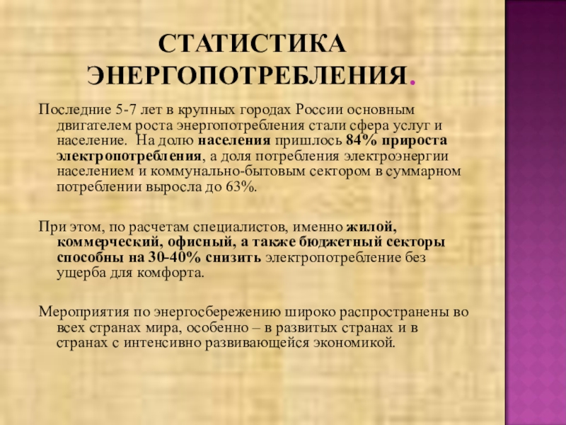 СТАТИСТИКА ЭНЕРГОПОТРЕБЛЕНИЯ.Последние 5-7 лет в крупных городах России основным двигателем роста энергопотребления стали сфера услуг и население.