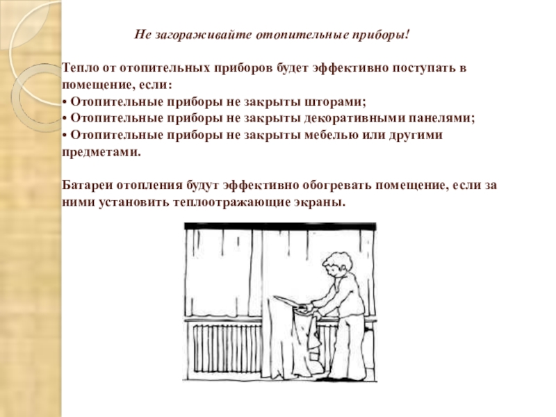 Не загораживайте отопительные приборы! Тепло от отопительных приборов будет эффективно поступать в помещение, если: • Отопительные приборы не закрыты шторами; • Отопительные приборы не закрыты декоративными панелями; • Отопительные приборы не закрыты мебелью или другими предметами. Батареи отопления будут эффективно обогревать помещение, если за ними установить теплоотражающие экраны.