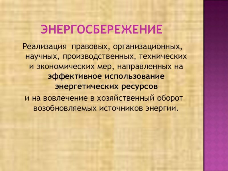 ЭНЕРГОСБЕРЕЖЕНИЕРеализация правовых, организационных, научных, производственных, технических и экономических мер, направленных на эффективное использование энергетических ресурсов и на